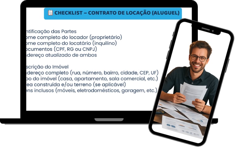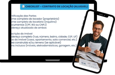 Para que você nunca esqueça nada importante, criamos um Checklist rápido com os pontos essenciais que todo contrato de aluguel precisa ter. Assim, você garante que seu contrato está completo, seguro e dentro da lei — sem complicação.”