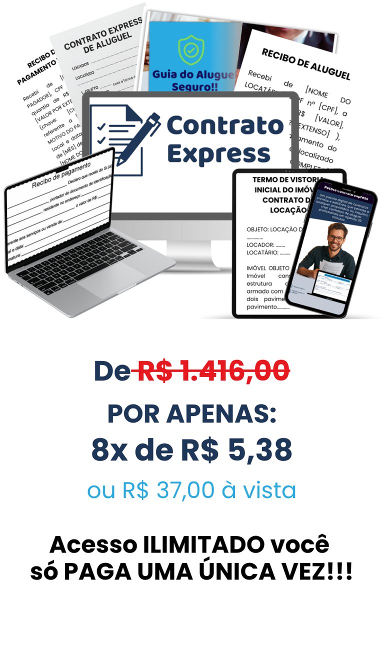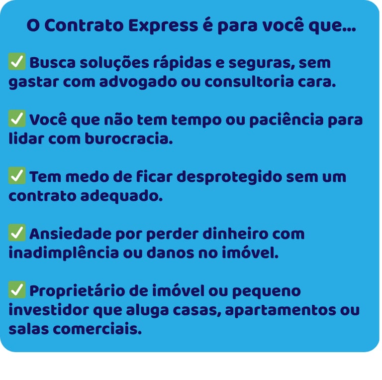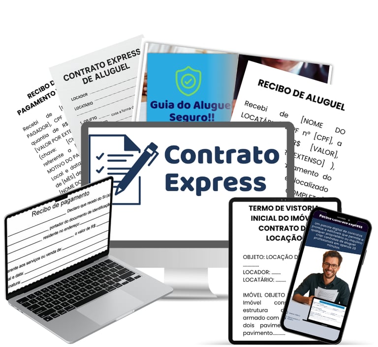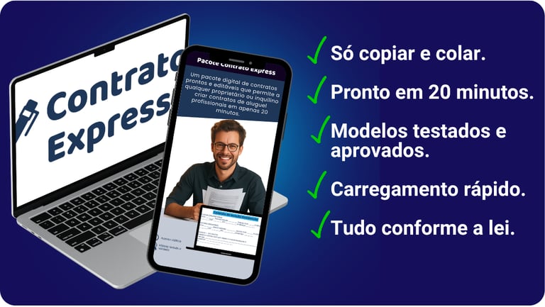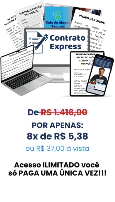 Percebi que muitos proprietários perdem tempo, dinheiro e tranquilidade por não terem contratos adequados — e foi por isso que criei o Contratos Express: um pacote com modelos prontos, 100% editáveis e dentro das normas jurídicas, onde você só precisa copiar, colar e preencher os dados.