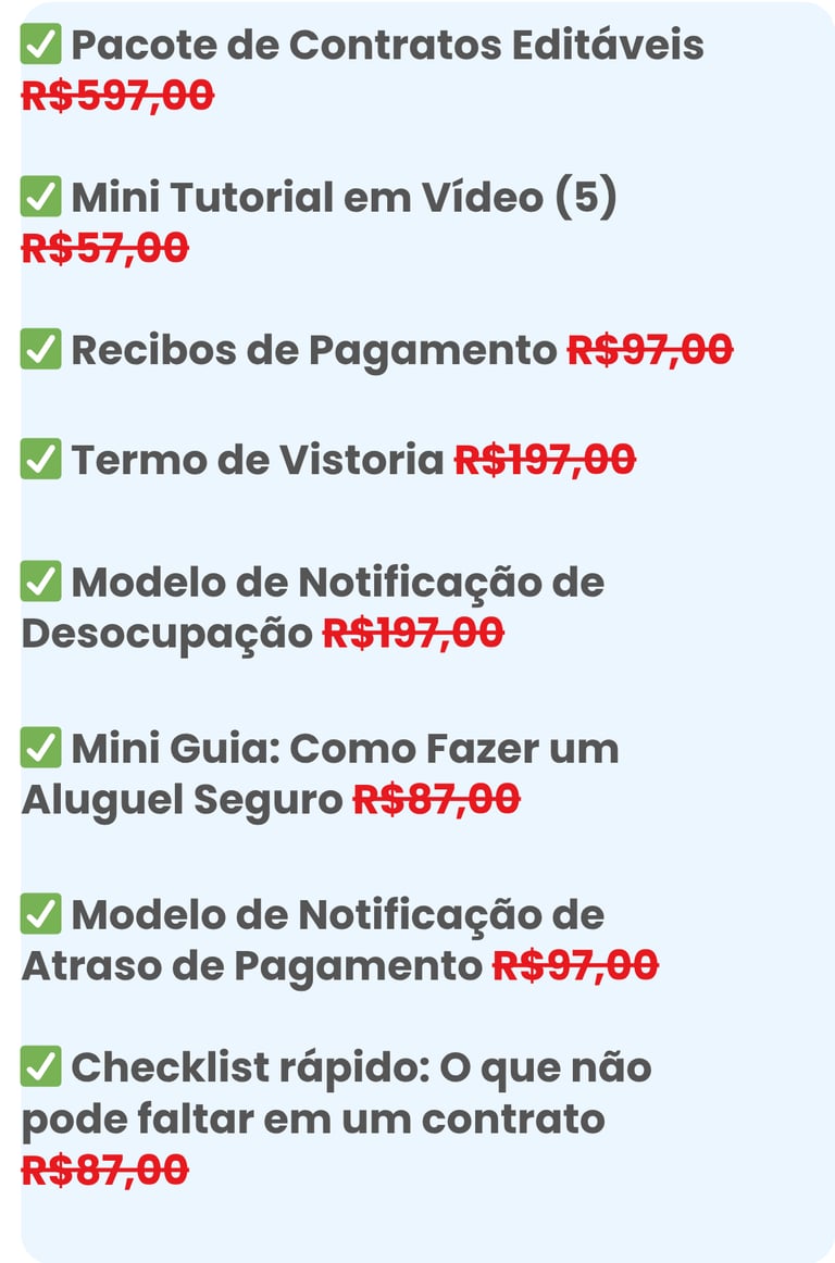 📄 Você tem acesso imediato a um kit de contratos prontos, editáveis e profissionais que garantem a proteção do seu imóvel e a tranquilidade do seu aluguel.